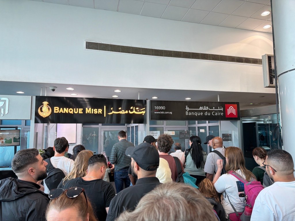 De dag begint op Düsseldorf Airport. Dit begon beter dan vorig jaar. Toen zou ik eigenlijk ook naar Caïro vliegen, maar bleek m’n paspoort niet lang genoeg geldig (3 maanden i.p.v. 6)… Dit jaar verliep het een stuk vlotter. Het was een comfortabele vlucht. Mooi op tijd landden we in Caïro. We hadden er al over gelezen hoe makkelijk het was om een visa on arrival te verkrijgen. Het klopt inderdaad dat je bij binnenkomst direct een visa kunt kopen. Ze hadden er even niet bij gezegd dat je dan moest aansluiten in een volle rij. Tenminste, een rij… iets wat een rij moest voorstellen. Alles dromde maar een beetje samen voor drie loketten. Welk loket je dan moest hebben was ook niet helemaal duidelijk in het begin. Uiteindelijk stonden we goed en konden we na ongeveer 45 minuten ons visum in ons paspoort plakken.