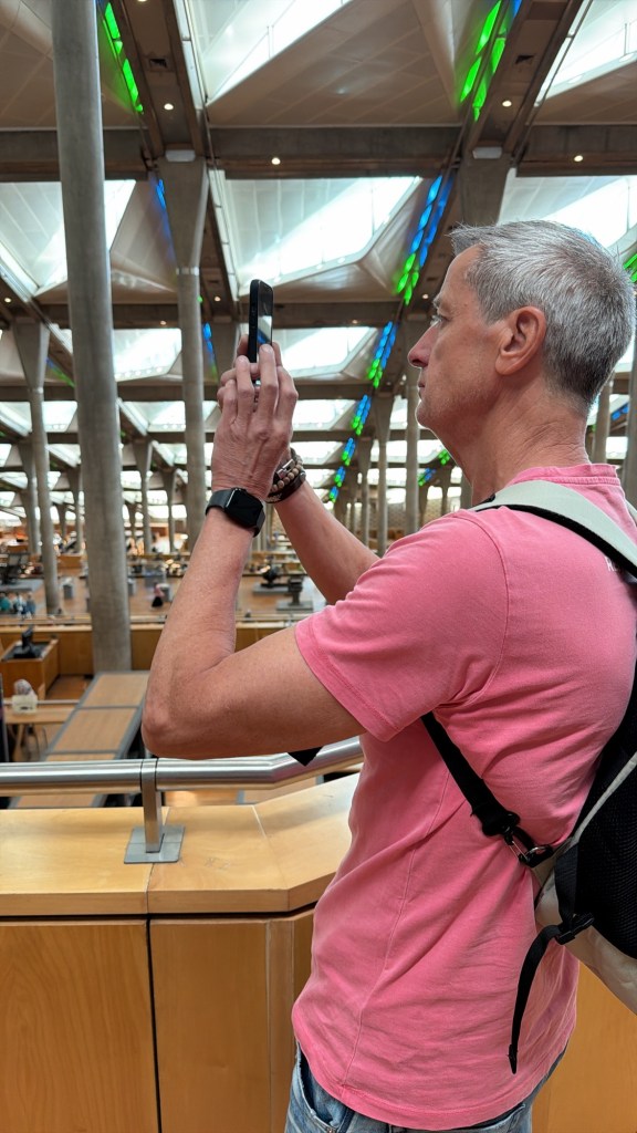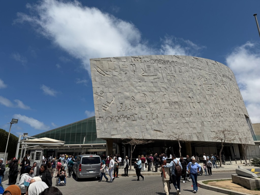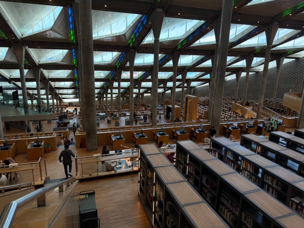 Nadat wij ons in een soort levend GTA bevonden, kwamen we uit bij de bushalte. Hier kochten we voor zo’n € 3,60 per persoon onze tickets. Hiermee reisden we in 2,5 uur naar Alexandrië. Hier aangekomen namen we een Uber naar de Bibliotheca Alexandrina. Ook in deze stad is er trouwens verkeerschaos. Onze taxichauffeur van gisteren gaf aan dat er gewoon geen orde is. Onze huidige chauffeur voelde ook geen stress ofzo met rijden. Hij hing rustig met zijn arm uit het raam en voorkwam de ene na de andere bijna botsing. Aangekomen bij de bibliotheek kochten wij tickets. Dit was, net als bij veel andere plekken, voor de toeristenprijs. Deze ligt vaak net iets hoger (lees dubbele prijs) dan voor de Egyptenaren… De bibliotheek was wel mooi om te zien. Het is helaas niet meer de originele bibliotheek. Dit was in het verleden (nog voor Christus) de grootste ter wereld. De oude bibliotheek is verwoest, maar in 2001 is een nieuw (modern) gebouw geopend op dezelfde plek. Als je er toch bent, is het leuk om even binnen te kijken.