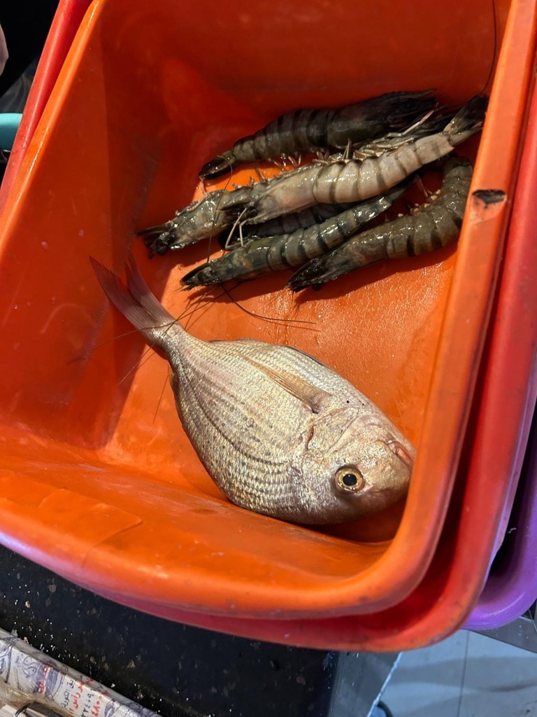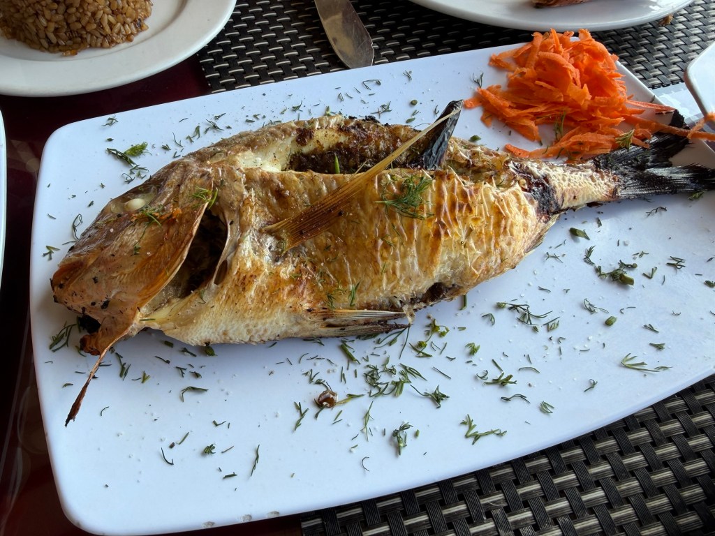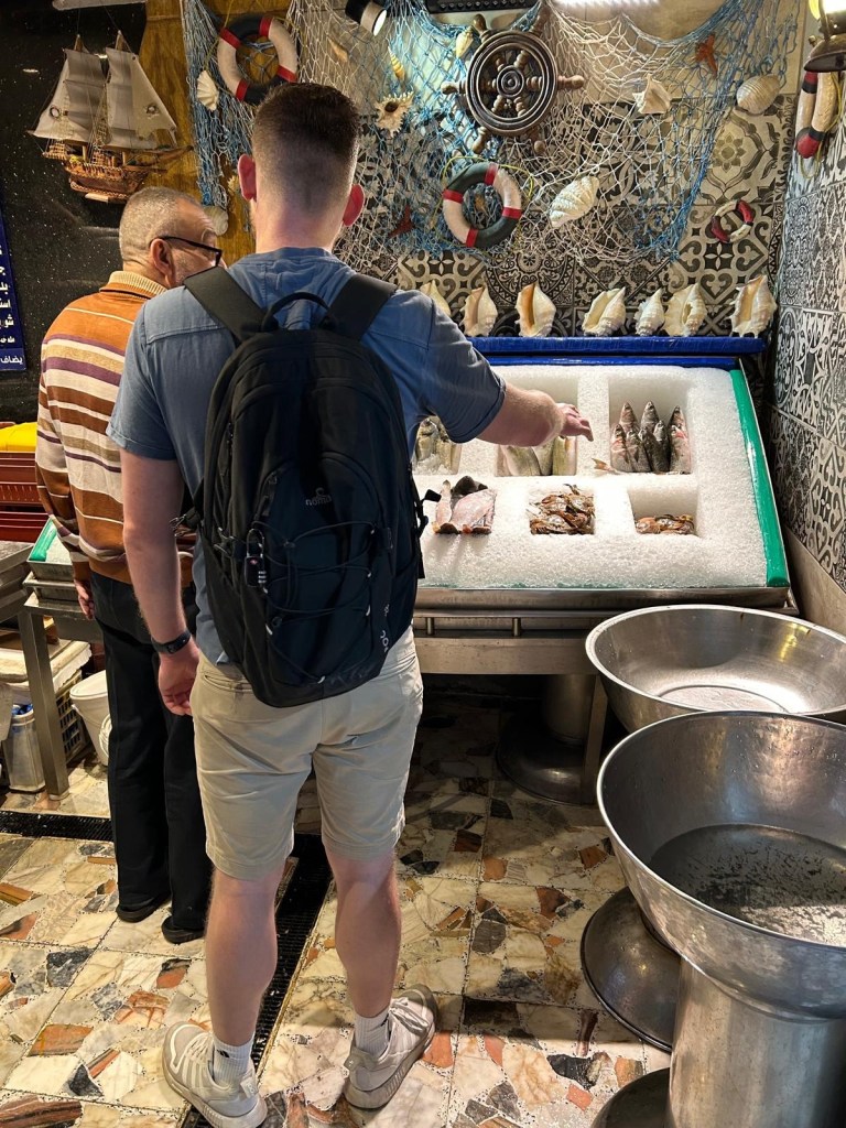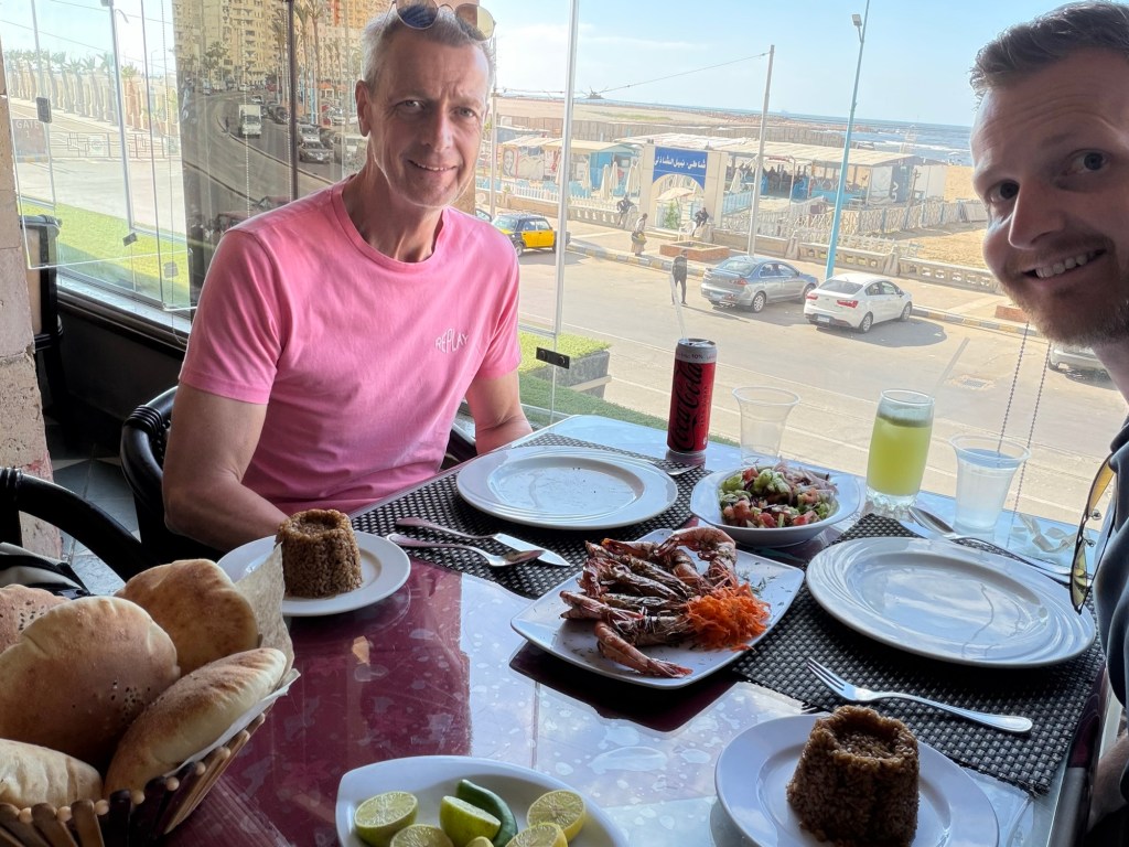Na de citadel liepen we naar een restaurant waar ze gespecialiseerd zijn in zeevruchten en vis. Toen wij binnenkwamen werden we meteen meegenomen in de richting van de keuken. Hier stonden verschillende bakken met vissen en garnalen. Wij moesten uitkiezen welke wij wilden. De man noemde de prijzen van de verschillende zeedieren. De man gaf mij zijn favoriete vis en ik koos nog 6 garnalen. Vervolgens kies je de bereidingswijze: Op de grill of gefrituurd. Wij lieten beiden grillen. Vervolgens konden we boven plaatsnemen. De tafel werd gevuld met een salade, stukken limoen en (natuurlijk) Egyptisch brood. Dit laatste krijg je overal geserveerd. Om de hoek bij ons hostel zit ook een bakker die de broden veelvuldig rondbrengt. Ik zal proberen nog foto’s te maken van dit fenomeen. Al het eten dat wij kregen smaakte erg goed! Een mooie afsluiting van onze dag aan de Middellandse Zee.
