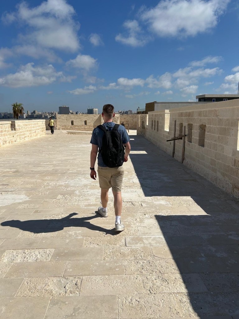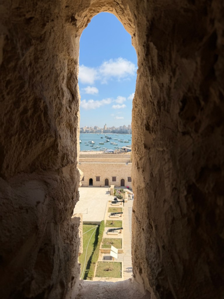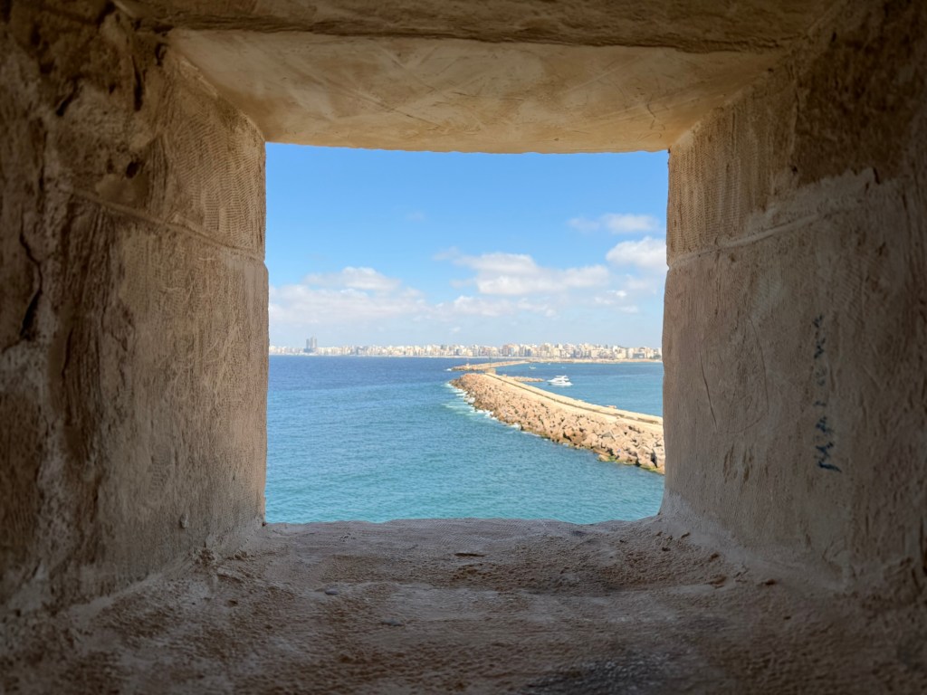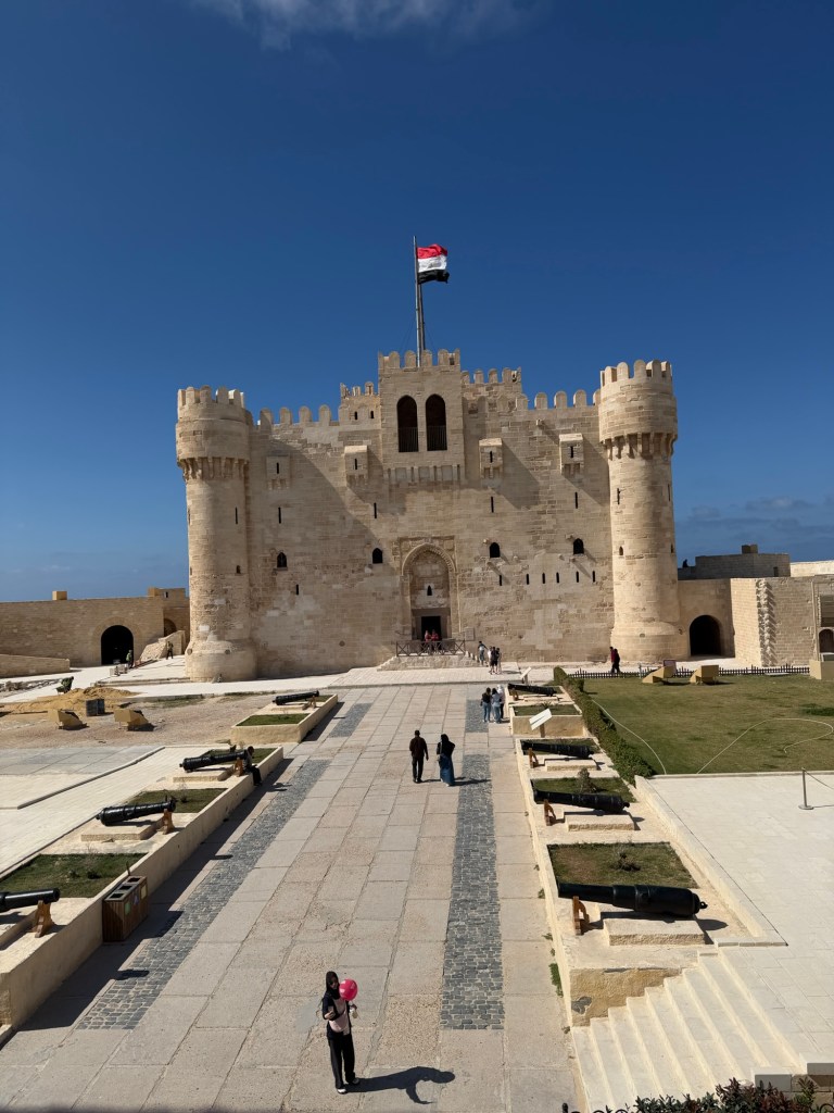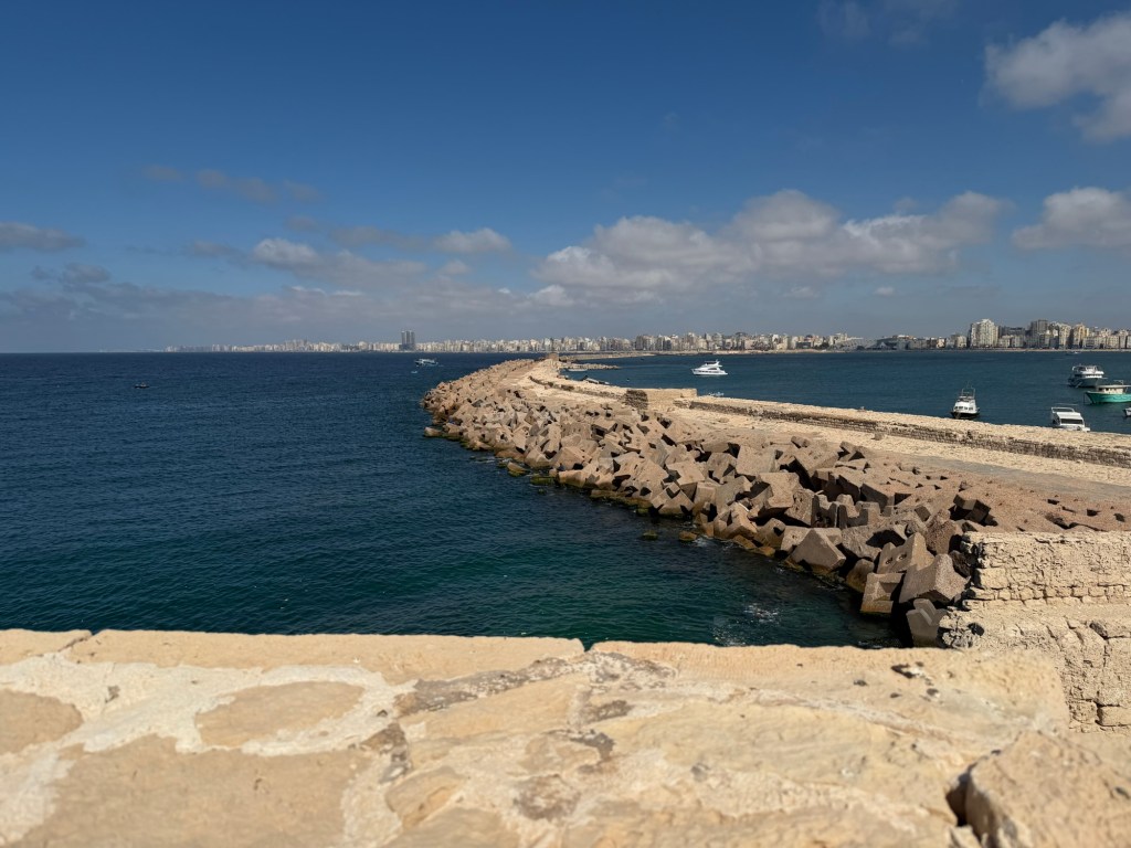 Vanuit de bibliotheek liepen we langs de boulevard van Alexandrië richting Qaitbay Citadel. Tussendoor even een snelle stop bij een 100 jaar oude bakkerij. Hier namen we een lekkere snack. Vervolgens liepen we verder en kwamen we aan bij de Citadel. Dit is een bijzondere plek, omdat hier vroeger de vuurtoren van Alexandrië stond. Dit was één van de zeven wereldwonderen van de oude wereld. Helaas is ook deze verwoest door natuurgeweld. Met de resten van de vuurtoren is vervolgens Qaitbay Citadel gebouwd. Toch wel een bijzondere plek dus. Het bezoek aan dit fort was dan ook wel de moeite waard. Al is het maar voor de mooie uitzichten die je hebt. Wel oppassen met het maken van foto’s. Ik klom namelijk op de muur voor een foto. Ik vroeg mij al af of dit wel mocht. Iets verderop zag ik later dat het beklimmen van het monument een misdaad (crime) is. Hiervoor krijg je een boete van 1000 EGP!