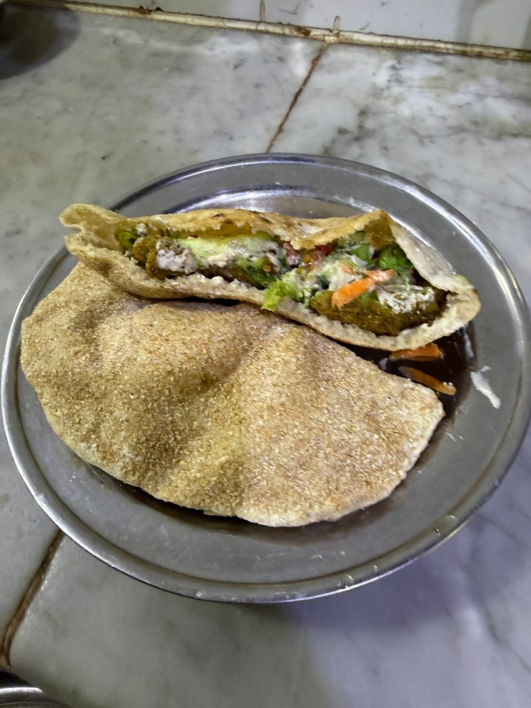 Onze dag startte bij een restaurant om de hoek bij ons hostel. Of nouja, restaurant. Zeg maar een gat in de muur waar een kleine keuken staat en een soort bar om aan te eten. Hier bestelden we een typisch Egyptisch ontbijt. Egyptisch brood gevuld met ta’ameya. Dit laatste lijkt op falafel, maar wordt gemaakt van favabonen in plaats van kikkererwten. Misschien is dit niet het eerste waar je aan denkt bij een ontbijt, maar in Egypte is dit gebruikelijk. Voor nog geen 100 EGP bestelden we 3 broodjes. Vanuit hier vervolgden we onze weg naar Tahrir Square. Vanuit daar zouden we de bus nemen.