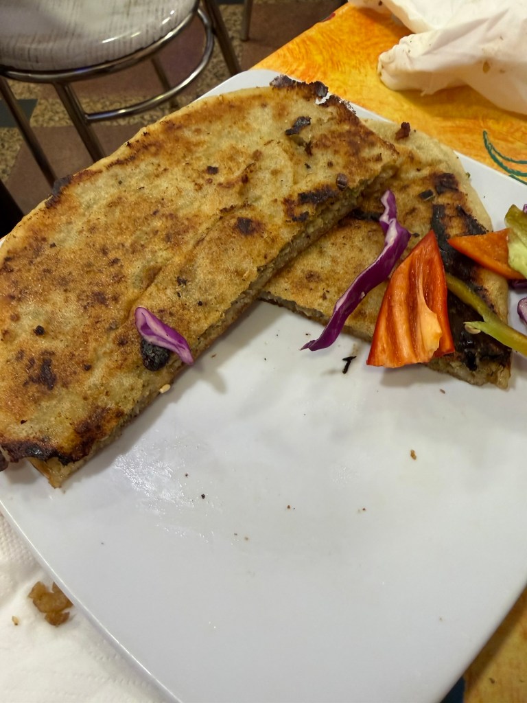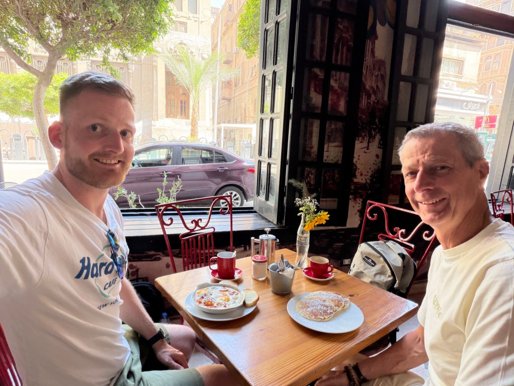 De dag startte bij Eish + Mahl. Dit restaurant werd aangeraden door ChatGPT. Ik wilde namelijk nog een typisch Egyptisch ontbijt hebben genaamd: shakshuka. Thuis maak ik dit wel eens als avondmaaltijd, maar oorspronkelijk is het een ontbijt. Het bestaat uit kapot gekookte tomaten met ei bovenop. Dit wordt geserveerd met Arabisch brood. Toen we het restaurant binnenkwamen, was het zo goed als uitgestorven. Ergens verbaasde mij dit niet. Chat wees ons vaker naar toeristische plekjes die inmiddels te duur zijn voor locals. Voor een volgende vakantie ga ik toch maar weer zelf op zoek… De shakshuka smaakte goed, alleen miste ik mijn Egyptisch brood om mee te eten. In plaats daarvan kreeg ik twee lullige stukjes geroosterd stokbrood. Mijn vader koos voor safe en bestelde pannenkoeken. Na een hapje van mijn shakshuka had hij hier toch spijt van. De hele vakantie eet hij al wat ik kies, maar nu koos hij voor safe.