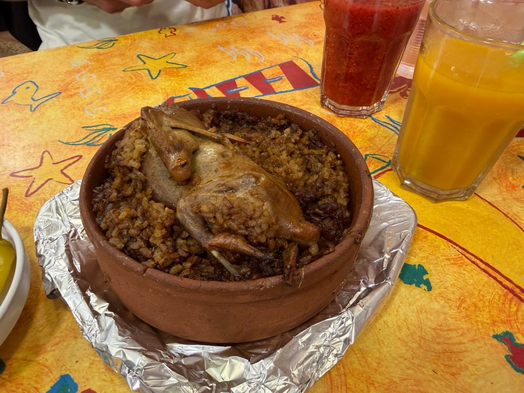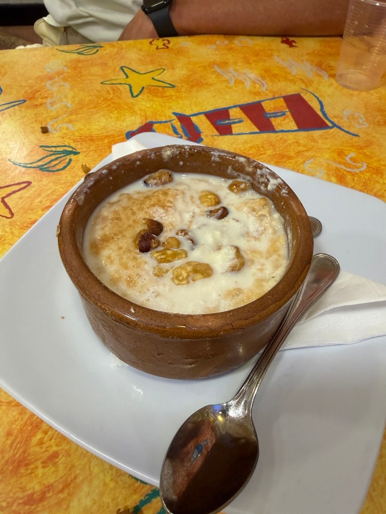 Na deze activiteit gingen we door met een andere Egyptische traditie en daarmee maaltijd. Een bekend gerecht in Egypte is hamam mahshi. Letterlijk vertaald: duif gevuld. Het bijzondere aan deze traditie is dat je, net als met de vis, de duif kiest die je wilt eten. Deze wordt vervolgens voor je bereid. De duif wordt gevuld met een kruidige rijst. Naast de duif bestelden we hawashi. Dit is een Egyptisch brood gevuld met (in ons geval) kip. Dit wordt vervolgens gebakken op een grillplaat. Met deze maaltijd had ik bijna alle Egyptische maaltijden gehad die ik wilde proeven. De duif viel wat tegen. Dit kwam vooral omdat er nauwelijks vlees op zat. Verder smaakte het gewoon als kip. De rijst was dan weer erg lekker. Ook de hawashi zou een goede snack kunnen zijn. Het was lekker, maar paste niet zo goed als maaltijd vonden wij. Meer iets wat je eet na het stappen ofzo. Als dessert bestelden we nog om ali. Dit is een soort broodpudding. Het wordt gemaakt van bladerdeeg, zoete melk, vanille, kaneel en noten/rozijnen. Een erg lekker toetje! Wel heel zoet.